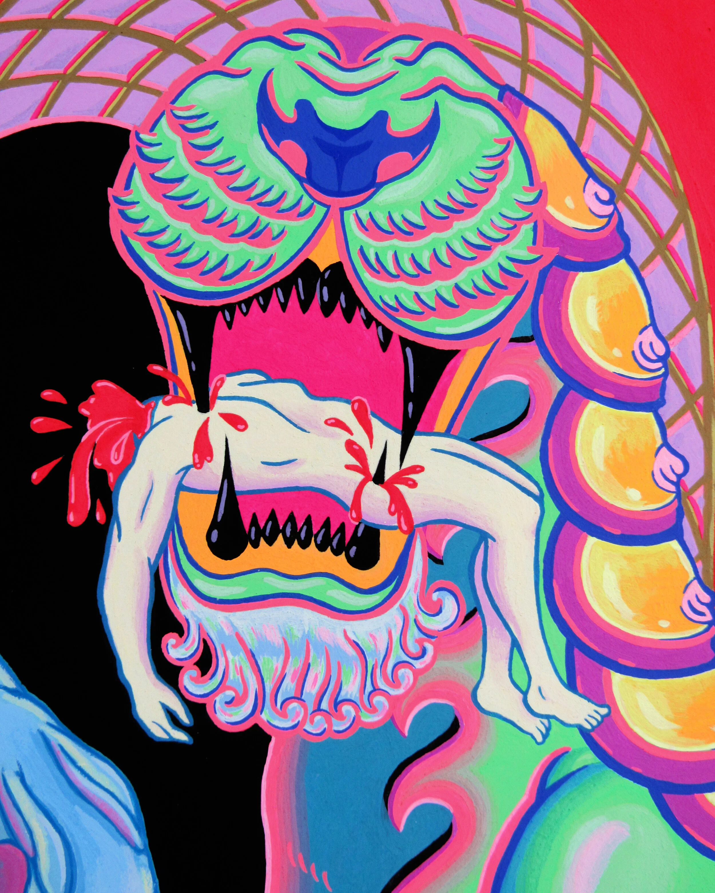 This piece is about feminine rage. The lion-like creature is a chimera between western depiction of lions in etchings of composite beasts and the Cantonese lion dance lion costume. Bunnies are considered gender-ambiguous in my symbolic language. As a student in Hong Kong, I had to memorize The Ballad of Mulan, and the last stanza always stayed with me:
